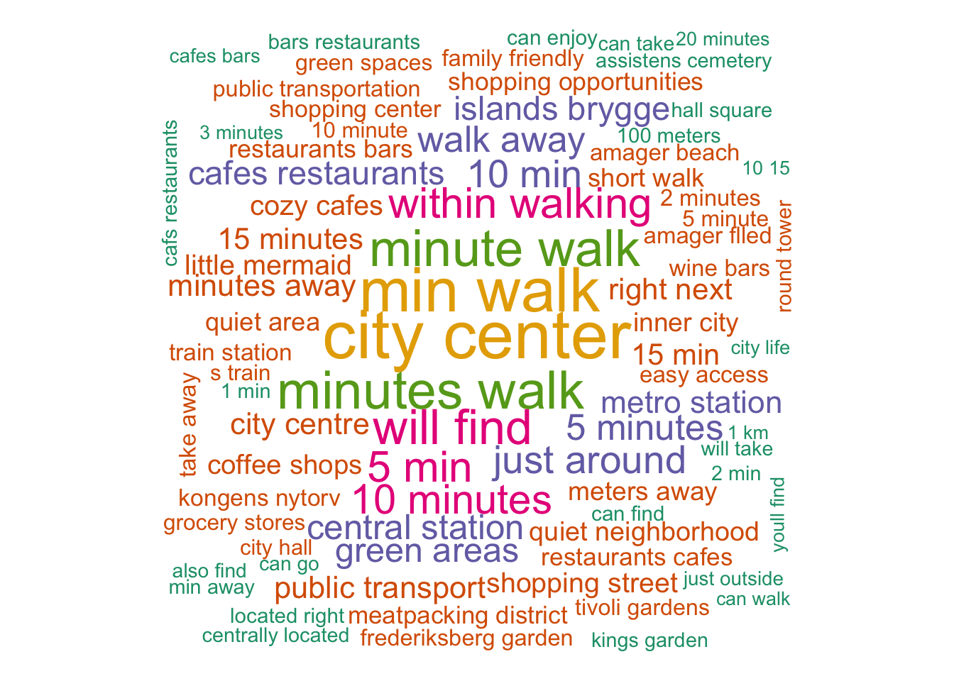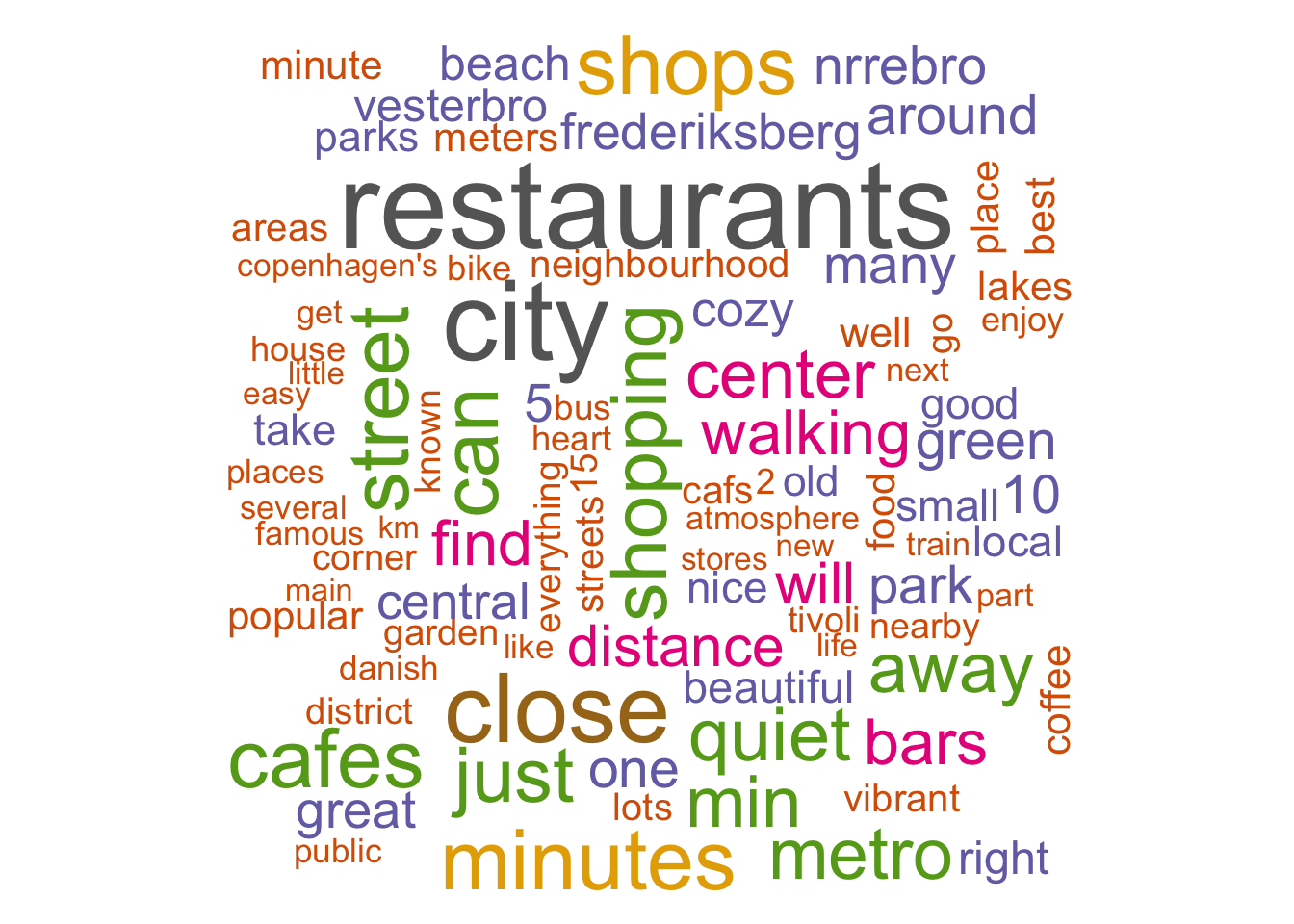 Outside of Copenhagen, city planners and analysts in other major urban cities could gain insights into what amenities, price points, and property types travelers prefer. Our modeling techniques, particularly the regression model and clustering analysis, could be replicated using other cities’ datasets to better understand their own local rental markets. Identifying which property features drive price premiums or rental satisfactions could help shape tourism strategies and investment decisions in cities with similar rental markets. Finally, marketers across the travel, real estate, and hospitality sectors would find significant value in this data mining work. Airbnb hosts, hotel brands, real estate agents, and tourism boards could all use our insights to better tailor their marketing strategies. In particular, our word cloud and clustering could help marketers craft more effective messaging by emulating key neighborhood descriptors and property features that are successful with Copenhagens’ guests. Popular property types, frequently mentioned listing characteristics, and pricing strategies identified in our analysis provide guidance for designing compelling marketing and promotional campaigns.