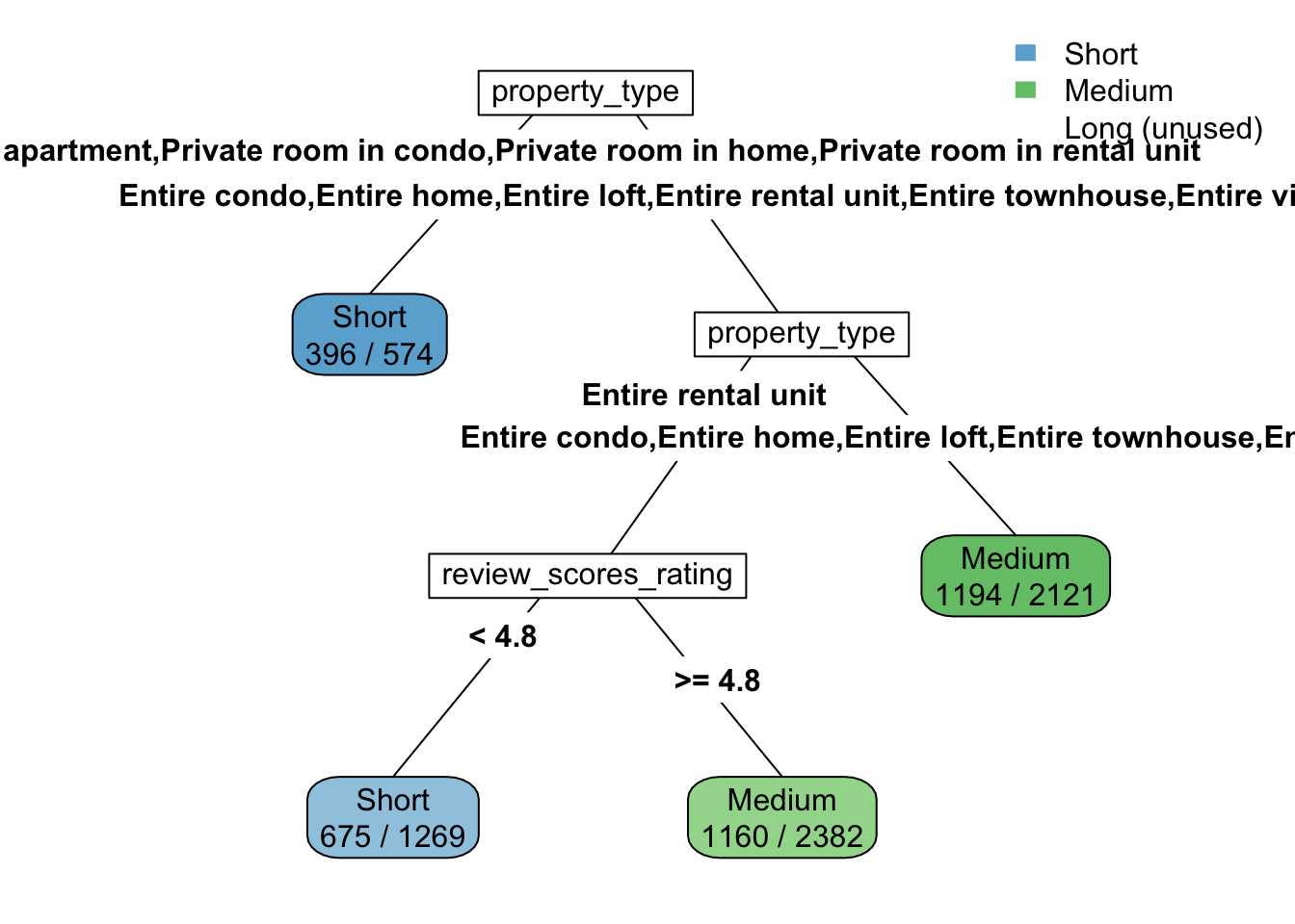 Property type, price, and number of bedrooms are among the most influential variables in predicting whether a rental is short-, medium-, or long-term. However, since the overall model performance is not so high, it suggests that rental duration is hard to predict based on listing features alone. Other factors — such as individual traveler preferences, trip purpose, or external events — likely play a major role in determining how long guests stay, but these factors are not captured in the dataset.