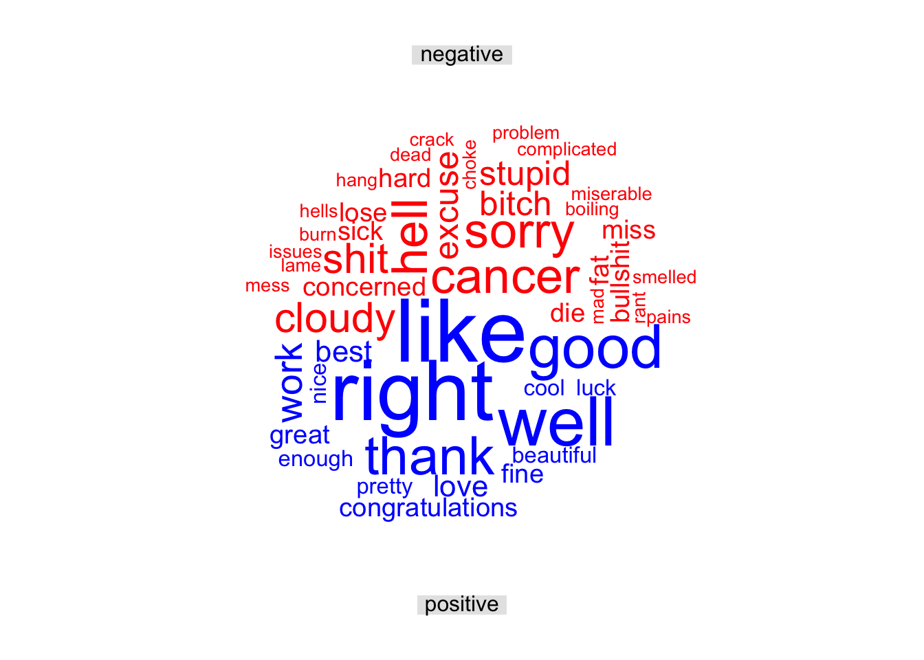 comparison.cloud(colors = c("red", "blue"), max.words = 50, title.size = 1)
