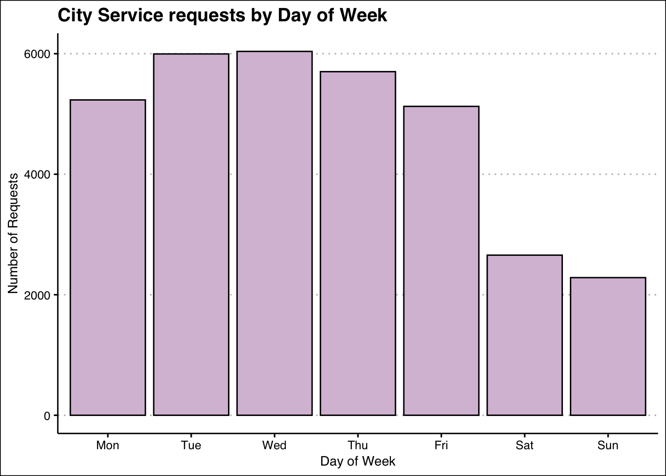 The bar chart displays how many requests were made each day of week.Weekends have only about half the volume of requests, and the middle of the week is when the highest number of requests are occur. Maybe in the weekdays people tend to have more time or prefer to report rather than on weekends.