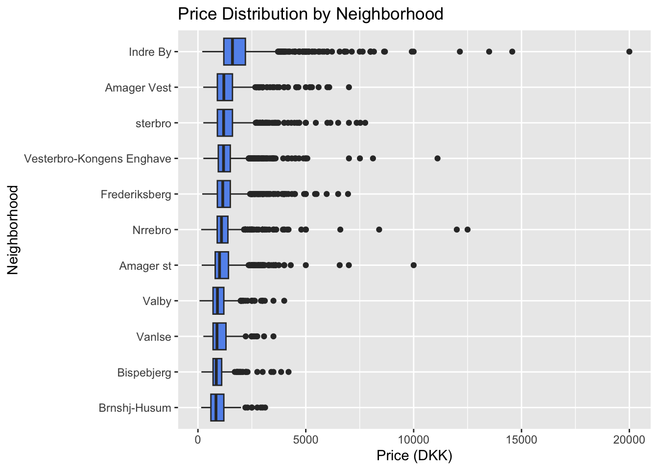 We first used table to see the different neighborhoods and how many listings were in each one. There are 11 neighborhoods and we chose to keep them all as these are the 10 municipal districts of Copenhagen plus Frederiksberg, which is its center. It felt like these would all be distinct and not too overwhelming to look at. We also knew we were going to want to look at price so made sure to convert it to a numeric and remove the dollar signs and commas.