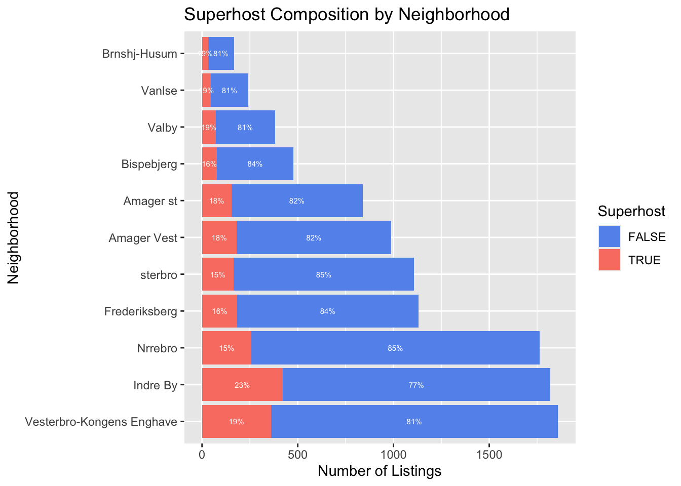 The first statistic we chose to look at was the average price per night for a listing in each neighborhood. We see here that the average price for listings in Indre By are basically double those in Bispebjerg and Brnshj-Husum. There’s quite a big range across the neighborhoods, so our takeaway is that different neighborhoods are more expensive—we don’t know why yet though, it could be due to demand or popularity or any other factor.