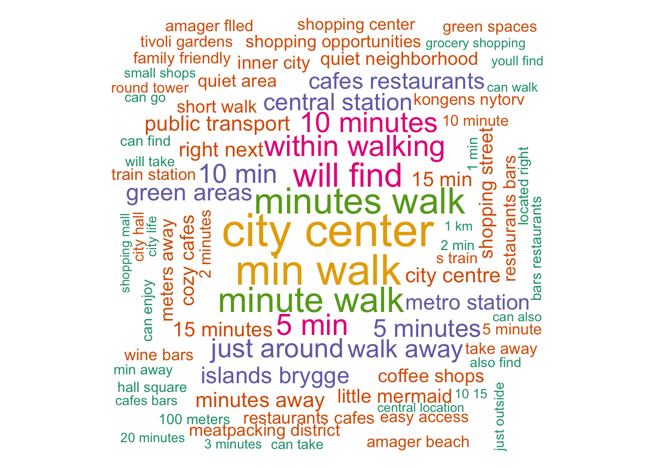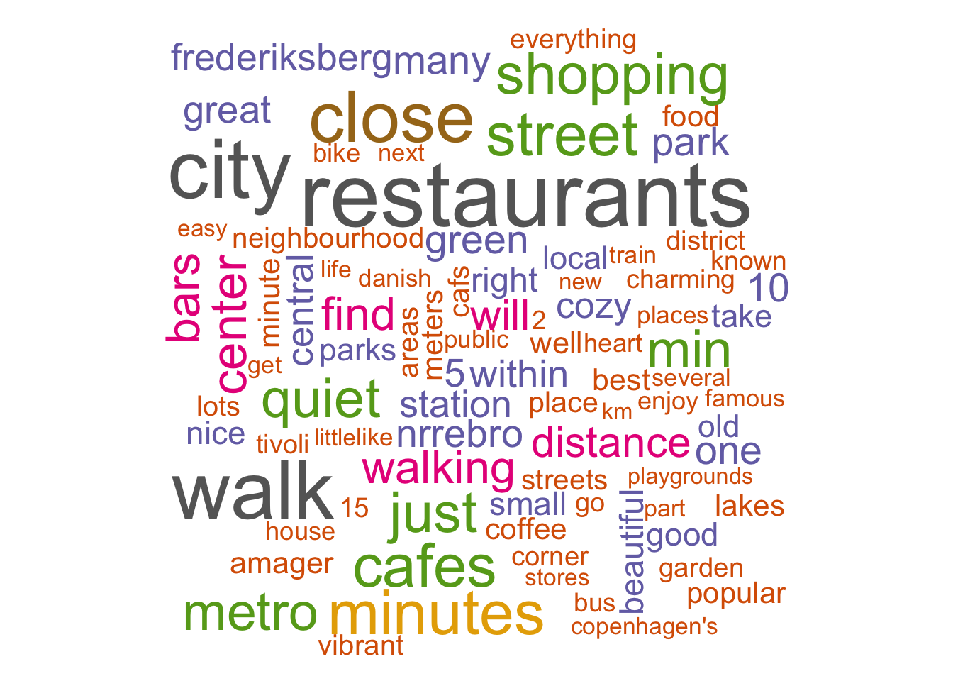 Outside of Copenhagen, city planners and analysts in other major urban cities could gain insights into what amenities, price points, and property types travelers prefer. Our modeling techniques, particularly the regression model and clustering analysis, could be replicated using other cities’ datasets to better understand their own local rental markets. Identifying which property features drive price premiums or rental satisfactions could help shape tourism strategies and investment decisions in cities with similar rental markets. Finally, marketers across the travel, real estate, and hospitality sectors would find significant value in this data mining work. Airbnb hosts, hotel brands, real estate agents, and tourism boards could all use our insights to better tailor their marketing strategies. In particular, our word cloud and clustering could help marketers craft more effective messaging by emulating key neighborhood descriptors and property features that are successful with Copenhagens’ guests. Popular property types, frequently mentioned listing characteristics, and pricing strategies identified in our analysis provide guidance for designing compelling marketing and promotional campaigns.