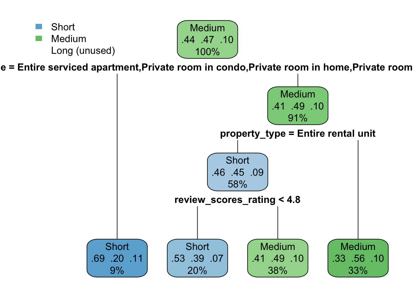 Property type, price, and number of bedrooms are among the most influential variables in predicting whether a rental is short-, medium-, or long-term. However, since the overall model performance is not so high, it suggests that rental duration is hard to predict based on listing features alone. Other factors — such as individual traveler preferences, trip purpose, or external events — likely play a major role in determining how long guests stay, but these factors are not captured in the dataset.