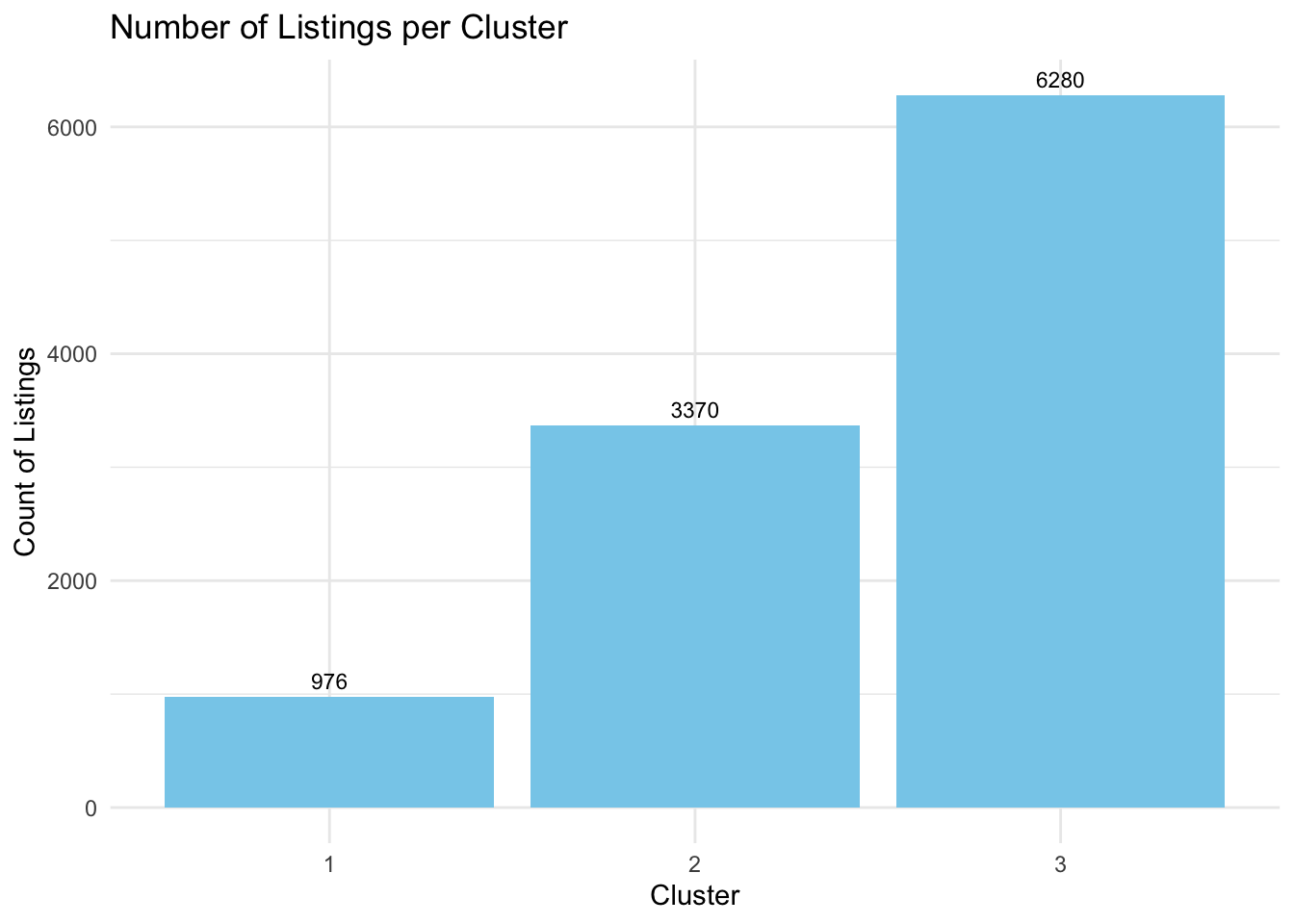 From first plot we see that, cluster 1 has 1890 values, cluster 2 has 6442, cluster 3 has 13214. Cluster 3 has a much higher amount of listings in it, suggesting the majority of listings are medium price, well reviewed, and have a greater number of bedrooms.