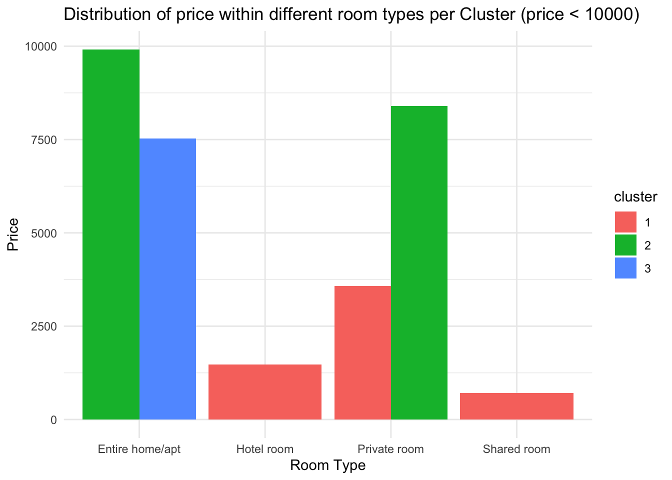 This plot shows the relationship between room type and price across clusters. We observe that Cluster 1 has the lowest prices, so it includes all kinds of room types . In contrast, Cluster 2 and Cluster 3 have much higher prices, and mainly offer entire homes/apartments. This suggests that higher-priced properties are usually entire listings, while lower-priced properties offer more diverse room options.
