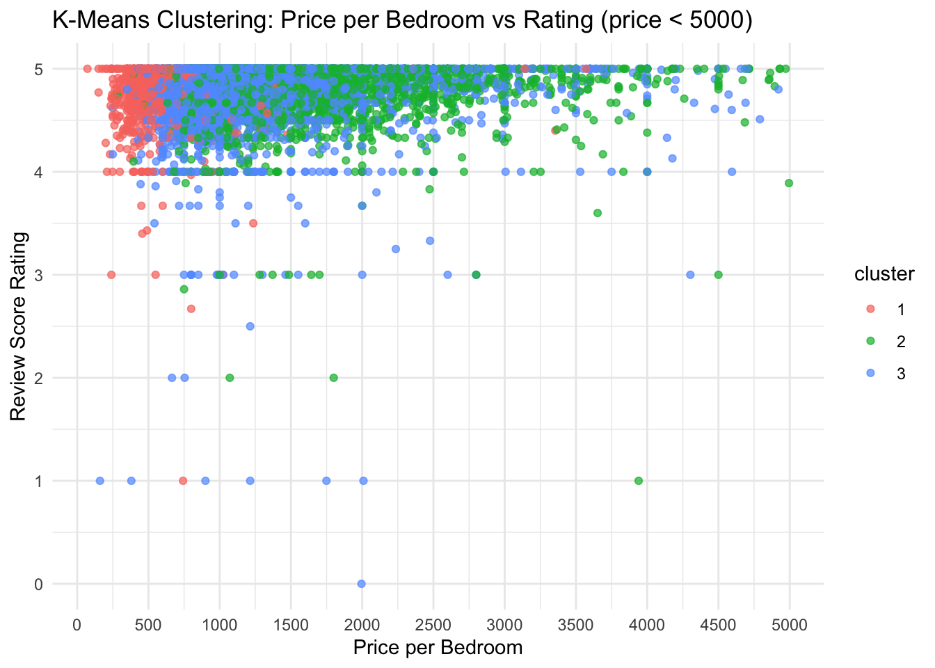 title = "K-Means Clustering: Price per Bedroom vs Rating (price < 5000)",