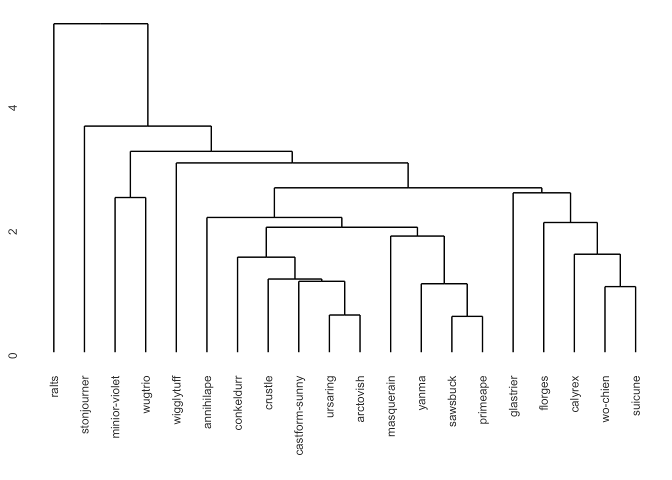 The number of clusters can vary depending on how we interpret the data. If we look for very distinct groups, we can see that the leftmost cluster is clearly separate from the others. Let’s draw a line with cut point=3, and group characters based on that. As a result we get 5 groups: {ralts}, {stonjourner}, {minior-violet and wugtrio}, {wigglytuff}, {others}.