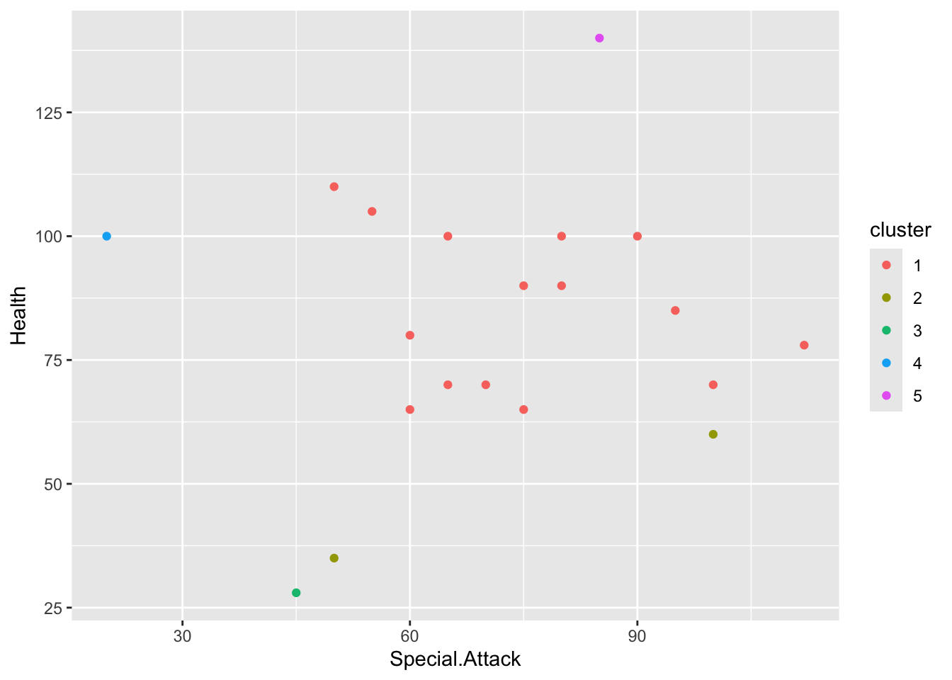 ggplot(rand_sp_numeric, aes(x=Special.Attack, y=Health, color=cluster)) +