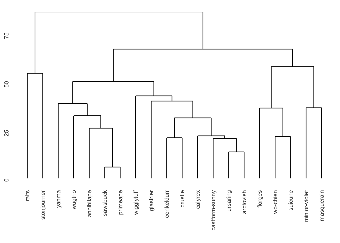 In new dendrogram, the y-axis now ranges from 0 to 75, compared to the previous range of 0 to 4. This shows a wider range of dissimilarity within clusters. Also, there are no singletons in this version — all items are connected to small groups. The way the items cluster together, and the distances at which these groupings happen, are also noticeably different compared to the unweighted version. For instance, before applying weight Pokemon Ralts didn’t belong to any clear group — it was directly connected to all the remaining ones. After applying the weights, Ralts is now grouped with Stonjourner, and together they are then connected to the rest.