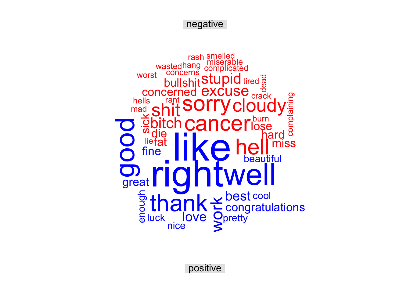 comparison.cloud(colors = c("red", "blue"), max.words = 50, title.size = 1)